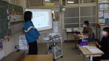 5年生の算数「変わり方」の授業です。表に書いて、変わり方のきまりを見つける学習です。歩いた時間と道のりの変化について表に表しました。プロジェクターで映した表を見て、きまりを見つけようと考えていました。