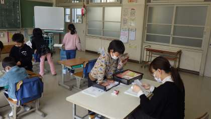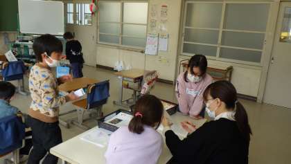 1年生の国語の授業の終わりの方にお邪魔しました。ワークシートが書けた子から、ステキみっけを書いたり、漢字のノートを書いたりしていました。「できたよ。」と先生のところへ持っていき、先生に丸をもらったり、一こと言ってもらったりすることが嬉しい様子の子どもたちです。