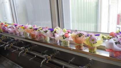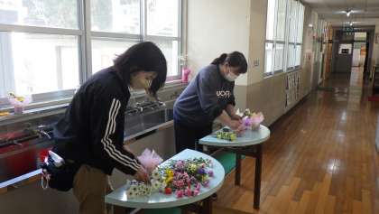 卒業式を明後日に控え、公務手と養護教諭がお花の準備をしていました。昇降口や受付、トイレ等いろいろなところに飾ります。会場を飾る鉢花の用意もできました。