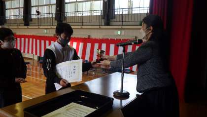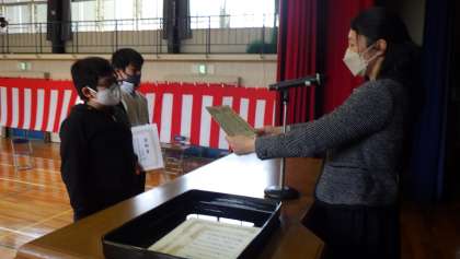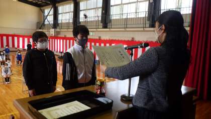 卒業式の予行練習の際に、6年生の皆勤賞の表彰がありました。6年間の皆勤と1年間の皆勤を表彰しました。がんばりました。