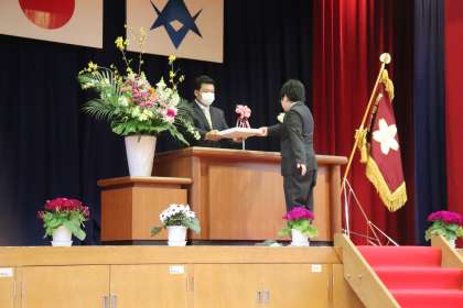 PTA会長様より「つらいとき、苦しいときにもくじけず、がんばってほしい。」などのお言葉をいただき、記念品を渡していただきました。
