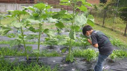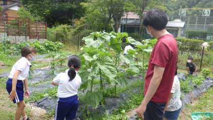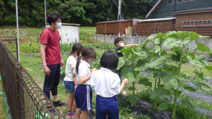 3年生が水やりや雑草ぬきをしにきていました。3年生はヒマワリを植えました。自分の顔より大きい葉っぱや身長より大きくなったヒマワリにびっくりしていました。
