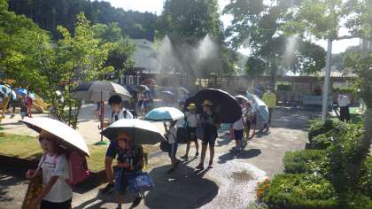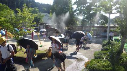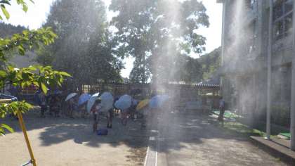 ミストを職員室前にも設置しました。ミストを稼働させると、風が起こります。その風が校長室の窓から入ってくると、ひんやりします。打ち水効果だと考えられます。下校時はじめて稼働しましたが、「涼しいでしょ。」と聞いてみると児童の感想は、「・・・。」