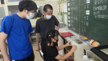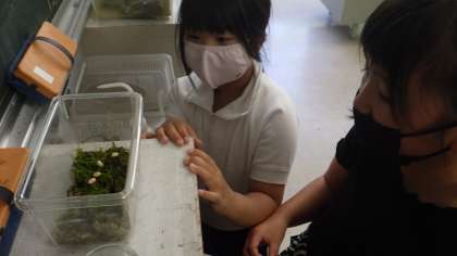3年生が友達のようにかわいがっているカナヘビが卵を産みました。以前から、カナヘビを繁殖させた話は児童から聞いていましたが、生まれた卵を実際に見て、子どもたち以上に喜んでしまいました。