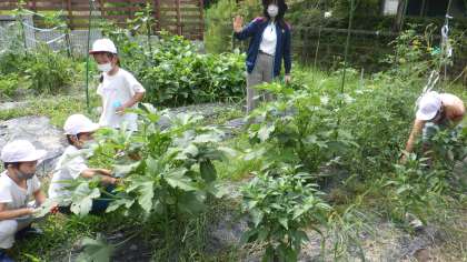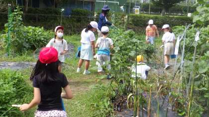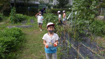 2年生が「ガーデンすくすく」(畑)でお世話と収穫をしていました。手にはいっぱいのプチトマト。そして大きく育ったオクラを見つけていました。みんな野菜に触って、思い思いの感想も言っていました。先生からは「いいところに気が付いたね」と褒めてもらう場面もありました。