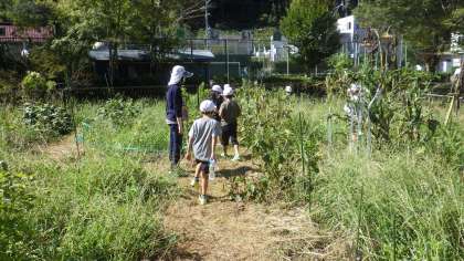 先日の学校クリーン活動できれいに刈られた畑で、2年生が野菜の観察とお世話をしていました。通路がきれいに刈られて野菜がすくすく大きく成長しているので、ちょっとした迷路のようになっていて楽しそうでした。