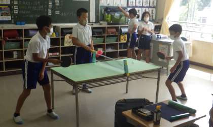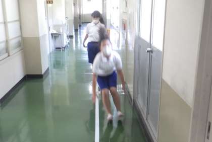 熱中症指数が32.4と本日も高いため室内で過ごしました。最近外出す部事ができない児童に、教室でもできる柔らかいボールを用意しました。廊下には、サーキット用のスペースが用意されています。児童は、思い思いの過ごし方をしています。