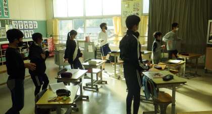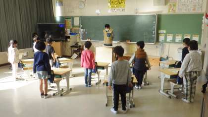 今日の朝の時間は、それぞれの教室で各学級の企画を行っています。話し合いをしていたり、読書をしていたり、「授業前のちょっとした運動」を行っていたりとクラスでまとまって活動しています。1年生のあいさつは、姿勢もよく元気いっぱいです。