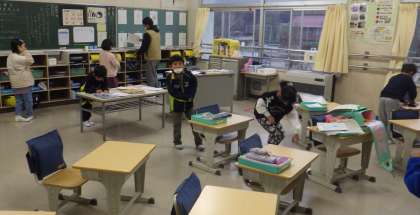 登校後の朝の1年生の教室です。1年生はいつも元気100%です。一緒にいるだけで元気になれます。このまま大人になってくれたらと願っています。今日は雨が降っているので、室内での生活が増えますが、けがをしないように元気に過ごしてほしいです。