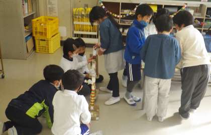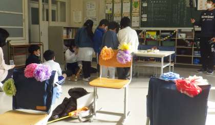 1年生が中金こども園の園児を招いて、交流会を企画しました。おもてなしの雰囲気つくりから、ゲームの内容までとても工夫されたもので、すごく楽しい時間となっていました。園児が飛び跳ねて喜ぶ姿に、きっと1年生も満足したことでしょう。