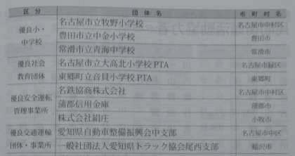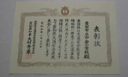 本校が表彰していただけるということで、愛知県交通安全県民大会に参加してきました。知事から表彰状を頂きました。県下の小中学校からは、本校も入れて3校が選ばれていました。交通安全に長年取り組んできたことに対する表彰です。植栽活動や折り鶴運動、標語やポスター作りなどの活動と交通事故が長年起こっていないということが選出された理由です。