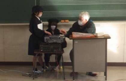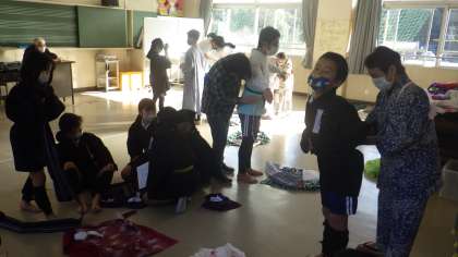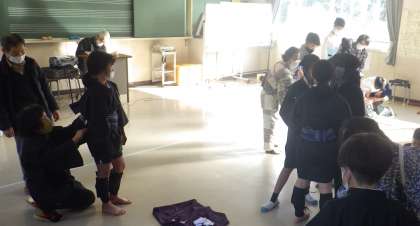 5、6年生が音楽室で総合の授業を行っていました。今は、石野歌舞伎の練習です。今日は、衣装を着けて練習します。その衣装を着るのに、講師の方たちのお手伝いを頂いています。2月4日の学習発表会に向けて、児童も頑張っています。