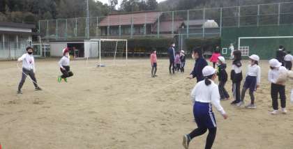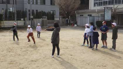 体力づくりの目的で今年からフレンドタイムを毎週水曜日に設定しています。全校で一緒に遊んで体力づくりにつなげることを目的としています。今日は、長縄を全校でチャレンジタイムに行っています。