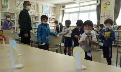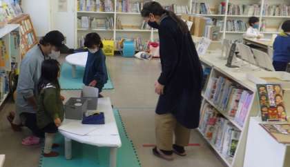今日の居場所は「まちかど図書館」でした。居場所スタッフの方たちにお世話になっています。「まちかど図書館」は身近にあるものを使って、自分で楽しむための遊び道具を作るところから始まります。今日は、紙コップと広告用紙(カレンダー)を使って的当てを楽しみました。毎回、工夫された遊びを紹介していただけます。