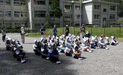 第1回避難訓練を行いました。避難指示をしてから、避難完了まで4分02秒でした。時間も素晴らしいと思いますが、避難態度が本当に素晴らしかった。「おはしも」の基本行動をしっかりと守り、整然と非難する1年生から6年生までの45名に感心しました。救助袋の体験時も無駄な話は全く聞こえてきません。素晴らしい中金っ子が育っています。
