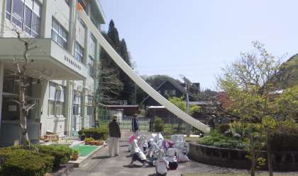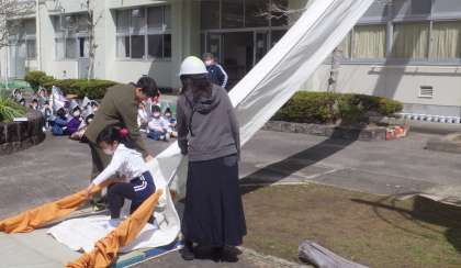 第1回避難訓練を行いました。避難指示をしてから、避難完了まで4分02秒でした。時間も素晴らしいと思いますが、避難態度が本当に素晴らしかった。「おはしも」の基本行動をしっかりと守り整然と非難する1年生から6年生までの45名に感心しました。救助袋の体験時も無駄な話は全く聞こえてきません。素晴らしい中金っ子が育っています。