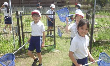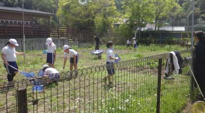 「ガーデンすくすく」で3年生が春の虫の観察をしていました。たくさんの虫が捕まったようです。アミで上手に捕まえ、むしかごに入れて理科室で観察します。当然、観察した後は、元の場所に返してあげます。とても楽しそうに活動していました。