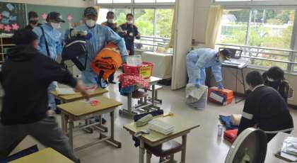 元気なみんなが顔を真っ赤にして外遊びをしている風景が、中金小学校の当たり前の状況になっています。今年も気温の上昇が心配されています。こんな時、注意しなくてはいけないのが熱中症です。先生たちもみんなが安全に生活できるよう、力石署から救急隊員をお呼びして、シミュレーション研修(熱中症予防)を行いました。先生方みんな、真剣に研修に参加しました。