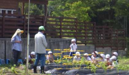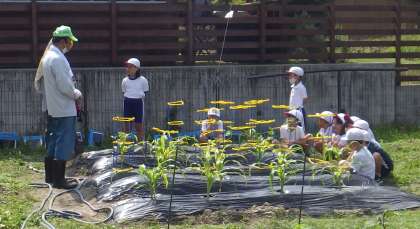 生活科で2年生が野菜を育てています。その臨時講師に本校の公務手さんになっていただきました。ご自宅でも野菜を栽培していて、収穫時には先生方に採れた美味しい野菜を配って頂けています。日頃から、児童のために多くの事をきっちりこなして頂けている公務手さんです。児童への話し方も自分のお孫さんに話しかけるような優しい口調でした。