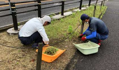 登校指導に向かう途中に植栽活動で植えたパンジーが咲く花壇があります。草が生え始めてきて、花を草が覆ってしまうような状況が何日かありました。それが、最近草がなくなっています。誰かが草を抜いてくださったと思っていました。今日、草を抜いている方が分かりました。鈴鍵さんの社員の方たちでした。とても爽やかな方たちでした。いろいろなことでお世話になっている鈴鍵さんです。いつもありがとうございます。