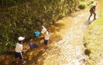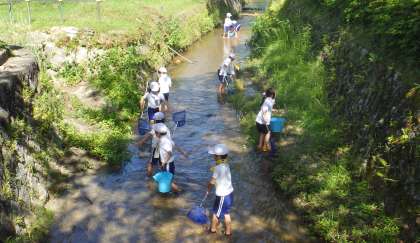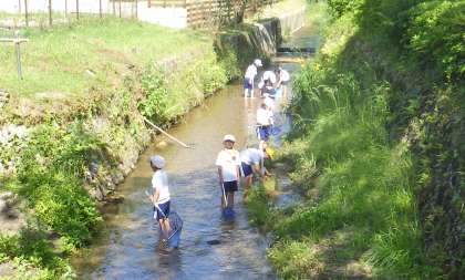 力石川に入って水中生物を探す活動が各学年で活発に行われています。長靴をはき、タモとバケツを持って入っていきます。教室には、簡易水槽が用意され、捕獲した水中生物を観察します。観察が終われば、川に返します。今日は、大きなドジョウが捕まったと歓声が上がりました。水が綺麗なところにしか生息しないカワニナも捕れます。子どもたちは、力石川がきれいな川だと確認していました。