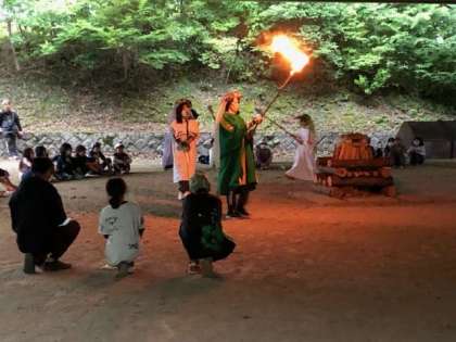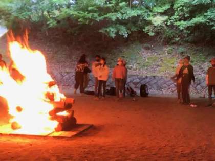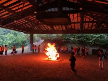キャンプのメインプログラムの一つ、キャンプファイヤーが始まりました。星は出ていませんが、雨は降ってません。みんな仲良く元気に活動しています。
