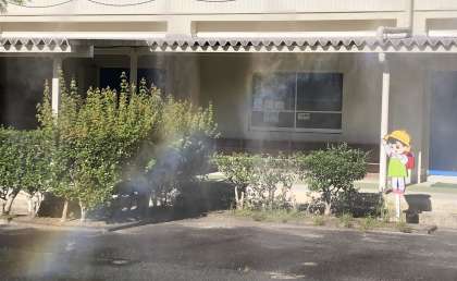 ミストを昨年同様に体育館前と職員室前に設置しています。ミストを稼働させると、風が起こります。その風はひんやりとし、とても涼しいです。打ち水効果だと考えられます。夏休み前は外で遊ぶことができずに、あまり稼働させませんでしたが、9月1日は朝から暑く、久しぶりに登校時に稼働させました。