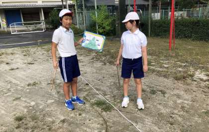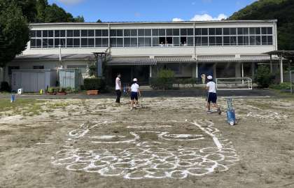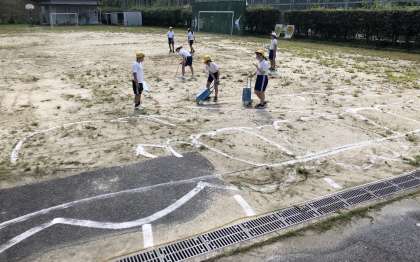 6年生が修学旅行の時に行く奈良の大仏の実大サイズの絵を運動場に書き上げました。とても面白い取り組みだと思いました。設計図を手に実際に書いた実物大の大仏は、とても大きかったです。修学旅行がまた一つ思い出深いものになることでしょう。