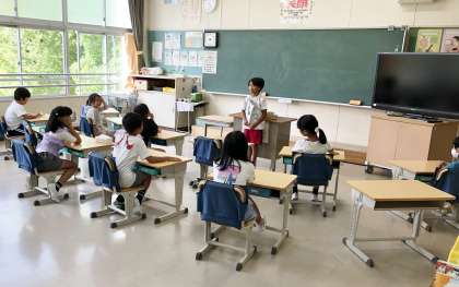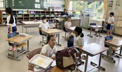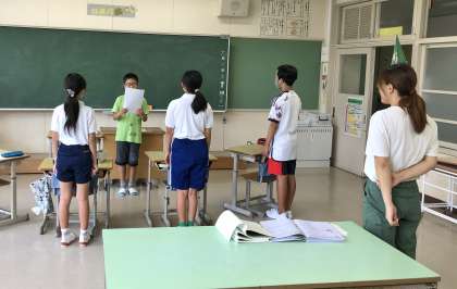 朝の会前の風景は、どこのクラスもリラックスした雰囲気で笑顔もたくさんあります。しかし、朝の活動が始まると引き締まった雰囲気に一転します。朝の会が始まり朝の挨拶練習をする5年生。日直の指示をいい姿勢で聞く落ち着いた2年生。タブレットを全員手にして全員で詩の朗読をするクラスもありました。いろいろな活動がクラスで決められ行われています。