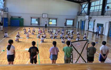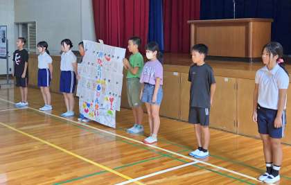 夏休みの課題で市に応募した作品が賞を頂けました。その表彰伝達と6年生が修学旅行報告・感謝を伝えました。そして今週の目当てを確認し、全校集会を終えました。今日も素晴らしい態度で集会を行うことができました。