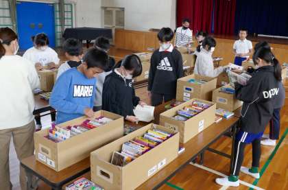豊田市から「市内の学校に図書(本)を買ってあげてください」と寄付金が寄せられたと連絡が入りました。それを受けて本校では本日ブックフェアを開催しました。本屋さんに来ていただき児童の皆さんに読みたい本を2冊ずつ選んでもらいました。これで90冊以上の本が中金小学校の図書館に入ります。みんな、楽しそうに本選びができました。