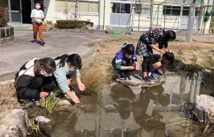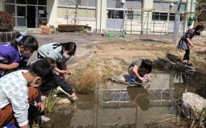4年生が育ててきたカワニナをビオトープに放流しました。大きく育ったカワニナから小さな小さな子供のカワニナまでたくさんのカワニナをビオトープに入れることができました。ビオトープでどんどん大きく育って欲しいと思います。