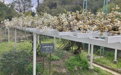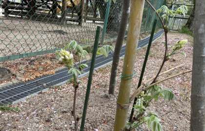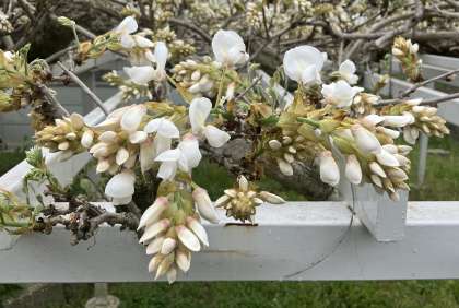 豊田市名木100選に指定され、校歌にも歌われているシロバナフジが綺麗に花を咲かせています。毎年、この時期のために昨年度中に綿貫さんを中心に手入れをしていただいています。本当にたくさんの花が今年も咲き始めています。さらに、昨年の5月下旬に親藤(豊田市名木指定21号)から新芽を分枝して挿木したものが植樹されました。何とその木にも花芽が付き咲き始めています。