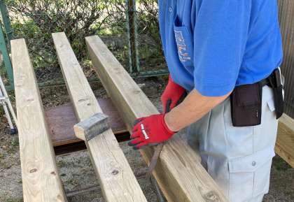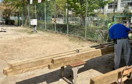 校内整備員さんが一生懸命に砂場づくりをしてくれています。昨年度は、古い砂を全部出して新しい砂を入れました。今年も3月に新しい砂を入れていただきました。今は、砂場の枠組みを作って頂いています。角材の面を落とし。危なくない状況で設置します。作業が丁寧で見ていて感心します。完成予定は、今月末です。完成したら、みんな砂場で大いに遊んでください。