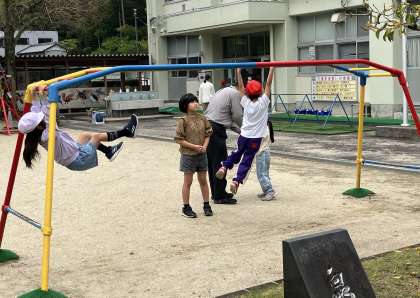 中金っ子の多くはサッカーがお気に入りです。学年や男女関係なく楽しむ姿は、とてもいい中金っ子の姿です。ビオトープの周りでは、低学年の子が走り回っています。まるで忍者養成所の様です。公務手さんには、ビオトープ周りの危険な物がないように整備していただいていますが、怪我なく放課が終わるとホッとしているのも事実です。中庭では、遊具で遊ぶ子たちもいます。ガーデンすくすくでは、昆虫を捕まえる人たちもいます。みんな、楽しそうです。