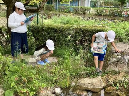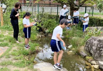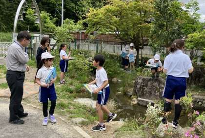 最近、ビオトープで植物や生き物の観察をする学年が増えてきました。とてもいい事だと思います。4年生のみなさんは特に生き物が大好きな学年です。ビオトープを観察していていろいろな事に気が付きます。そのたびに、みんなでその情報を共有する雰囲気がとてもいいです。今年からみえた谷口先生に色々な質問もしていました。6月には蛍が舞ってくれたらいいと思っています。本校のビオトープ学習は始まったばかりです。これからが楽しみです。