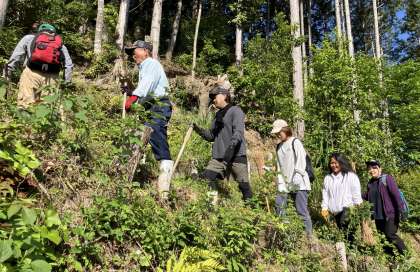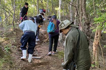 3年生の南山登山が安全にきるよう、綿貫さんとボランティアの方たち(地域の方や保護者の方)で山道の整備を行いました。昨年度も行いましたが、年々登山道が整備されてきている気がします。これも綿貫さんをはじめとする地域の方たちが、日頃から手入れして頂けているからだと思います。今日は、中金っ子が登るときに危なくないように、少し急な斜面に土を削って階段を作って頂きました。これで、綿貫さんの指示のもと当日は、安全にいろいろなことを学んで帰ってくることでしょう。