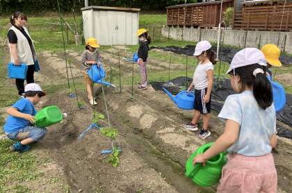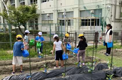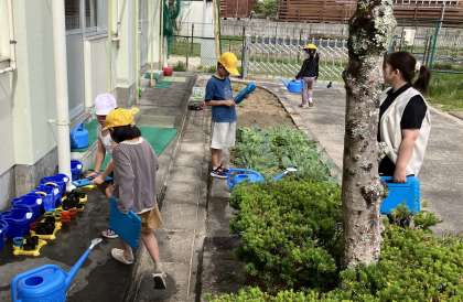 今日の5校時に「ガーデンすくすく」を見ると、2年生が楽しそうに水やりをしていました。自分が植えた苗が、どんどん大きくなっていくのを世話をしながら楽しんでいます。大きなジョーロを重そうに運ぶ姿は、少し逞しさも感じられますが、やはり可愛さが勝ります。きっとおいしい野菜が収穫できることでしょう。