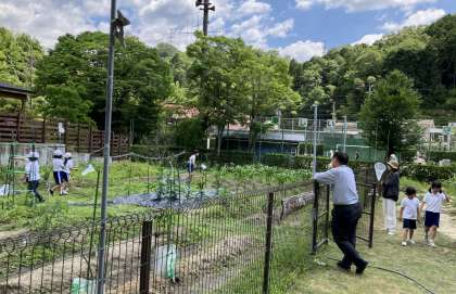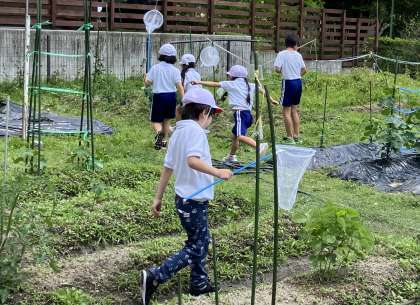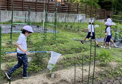 「ガーデンすくすく」で網を持った中金っ子が、一生懸命にモンシロチョウを追っています。頑張っていますが、なかなか捕獲できない様子でした。