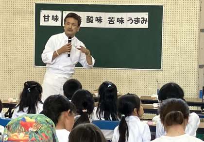 3、4時間目は、学校保健委員会を体育館で行いました。小牧の厳選素材を使った身体と心に優し料理を提供している人気店Chez Chouchou(シェ シュシュ)のシェフをお招きして食育の講義をしていただきました。保護者の方も参加して、シェフが作った料理の試食もさせていただきました。食生活について考える素晴らしい講義でした。