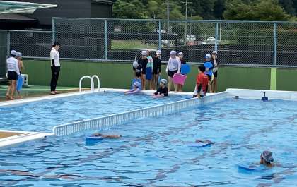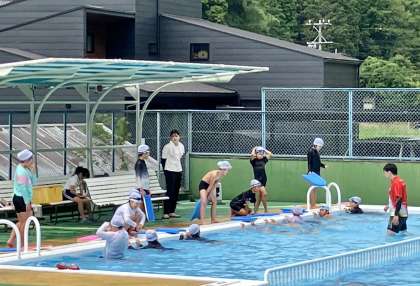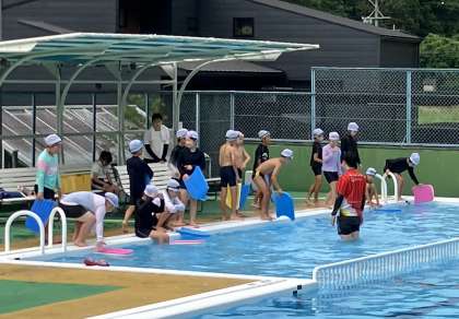 1時間目に3、4年生が体育の授業をプールで行っていました。蒸し暑い中でのプールはとても気持ちよく、みんな元気よくプールの授業を行っていました。今日は、とても難しい平泳ぎに挑戦していました。足の甲でのバタ足に慣れた者にとって、足の裏等でキックする平泳ぎの足の動作は、とてもイメージしにくく難しいです。でも、先生に励まされながら、一生懸命に挑戦する姿は、さすが3、4年生です。