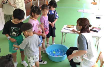 1年生が中金こども園の「夏祭り」に招待されて出かけていきました。自己紹介をし、ペアになった園児さんと楽しく、きんぎょすくいやピン倒し(ボーリング)、輪投げなどをを体験したり、みんなで楽しく踊りをしたりてきました。お土産ももらってきました。9人全員立派になった姿を見せてきてくれました。