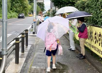 登校時に多くの方たちが立哨指導に参加していただけました。日影交差点には、雨にもかかわらず多くの地域の方、正門付近には、鈴鍵さんや民生・児童委員協議会の方たちであいさつ運動も行われました。地域の方たちと朝から気持ちのいい挨拶ができました。とてもいい地区です。
