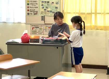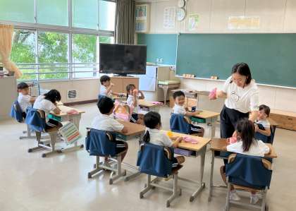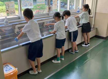 朝の会前の風景は、どこのクラスもリラックスした雰囲気で笑顔もたくさんあります。しかし、朝の活動が始まると引き締まった雰囲気に一転します。朝の会が始まり朝の挨拶練習をする6年生。日直の指示をいい姿勢で聞く落ち着いた1年生。今日はフッ素先行の日だったので、いつもよりも少し忙しい朝でした。しかし、どこのクラスもみんな落ち着いて行動で来ていて素晴らしいです。