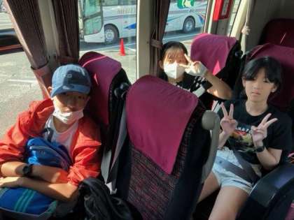 予定通りに針テラス道の駅でのトイレ休憩を済ませました。中金の3人は、バスの中で過ごしました。天気も良く、修学旅行日和です。