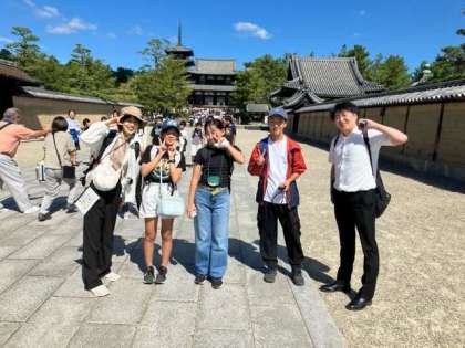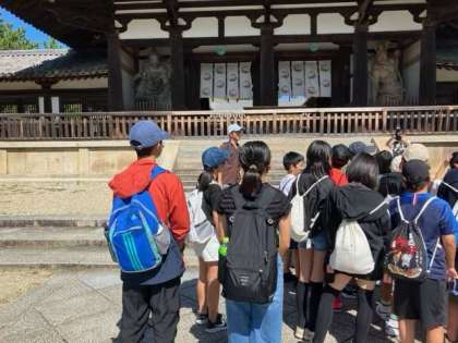 世界遺産の法隆寺に到着しました。ガイドさんの話を聞く態度がすばらしいです。