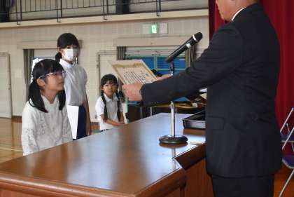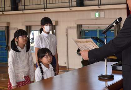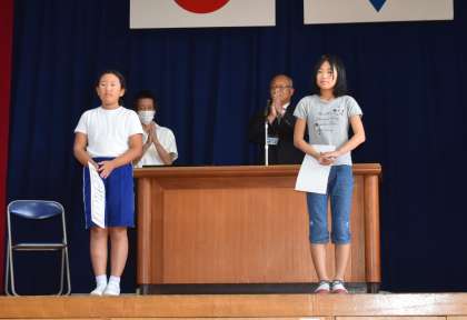 前期後期の切替式を体育館で行いました。まず素晴らしかったのは、体育館への入退場の仕方です。無駄話をする児童が本当にいません。とてもいい緊張感の中で、切替式が始まりました。次に何といっても代表児童のスピーチの素晴らしさに、何度も感動しました。表彰伝達を行い、校歌を歌い、後期の委員長会と副委員長、そして学級員の決意表明も立派でした。