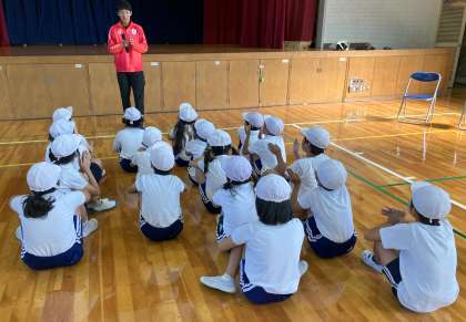 中京大学の先生でもあり、パリオリンピック男子4×400mリレー日本代表選手として出場し、400mアジア記録保持者でもある川端魁人先生を、高橋スポーツクラブの仲介で講師に迎え3、4年生が「走り方教室」を行いました。オリンピック選手と会うのが初めてだという3年生は少し緊張した感じもありましたが、日本代表の選手も同じ練習を実際に指導している青戸先生から教わり、走り方のポイントがわかってきた児童の走りは、素晴らしくかっこよくなりました。