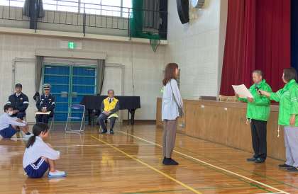 折り鶴大作戦は、今年で37回目です。交通安全を願ってずっと続いてきた行事です。みんなが交通安全の願いを込めて折った鶴は、メッセージカードと一緒に地域の人たちが集まる場所へ置き、そこを訪れた方々に持っていってもらいます。今年もカレンダーを作りました。ポスターや標語を募集し、選ばれた作品を載せています。そのカレンダーは中金小学校の学区の地域の全部の家に配られます。また、フェンスに掲示する横断幕やフラワーロードに掲示するポスターを今年も作っていただきました。これらの活動は、地域の方々の交通安全への啓発だけでなく、この活動に取り組む皆さんの心の中に「交通安全」がしっかり刻まれるために行っています。これからも皆さん自身交通安全に気を付けて、元気に楽しく暮らしていけるよう願っています。