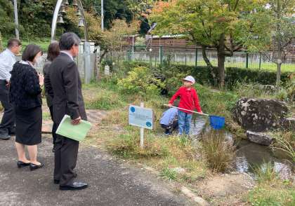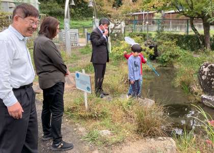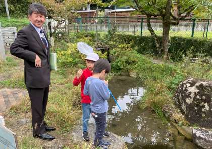 教育長さんは、子どもが大好きです。どこの学校に行っても児童生徒とふれあい、時には授業に参加するなどとてもフレンドリーな方です。今日は忙しい中での訪問で、中金っ子の頑張る姿を観て頂くことはできませんでした。教育長さんもとても残念がってみえました。もう一回教育長訪問をして、中金っ子の頑張りを観て頂けるそうです。お忙しい中ではありましたが予定滞在時間を大幅に上回り教育長訪問を終えられました。帰り間際にビオトープでかわいい中金っ子に出会い、笑顔で帰って行かれました。